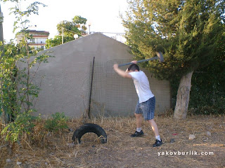 Нанесение ударов кувалдой или ломом по автопокрышке. Старинный боксерский тренажер. Тренирует силу удара и вообще все необходимые боксеру мышцы. Посмотрите видео, где я все подробно показываю и рассказываю.